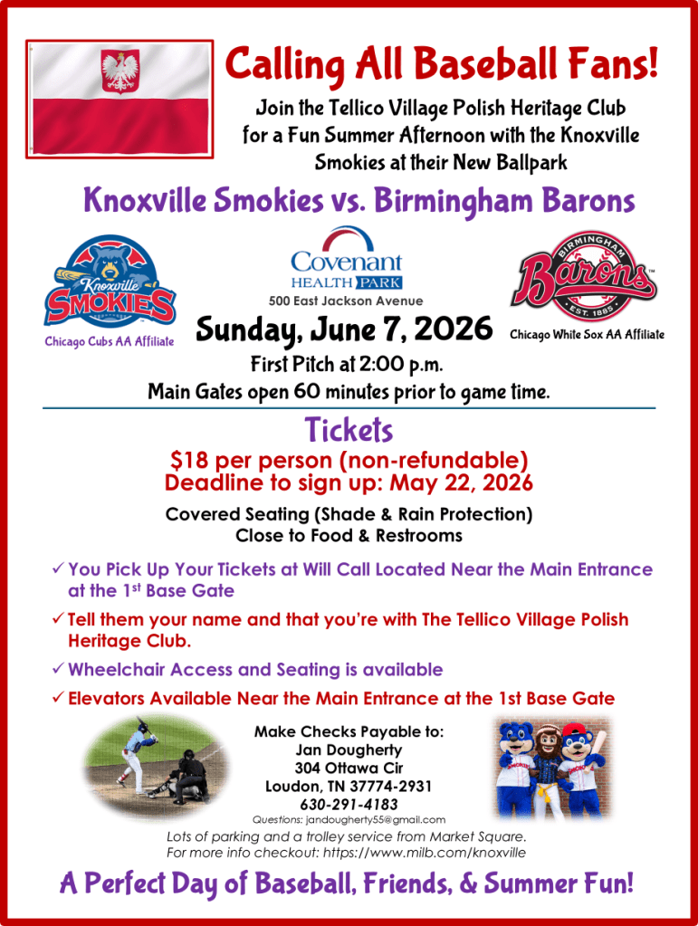 Checks are to be made payable to the Polish Heritage Club and mail to: Donna Ozog, 219 Mialaquo Circle, Loudon, TN 37774